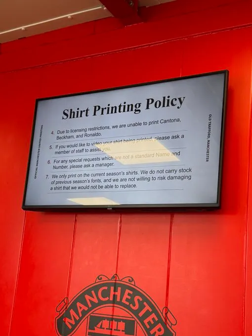 ตามที่แฟนบอลคนหนึ่งได้แชร์ภาพป้ายประกาศบนโซเชียลมีเดีย นโยบายการสกรีนเสื้อของ ยูไนเต็ด ระบุว่า “เนื่องจากข้อจำกัดด้านลิขสิทธิ์ เราจึงไม่สามารถสกรีนชื่อ คันโตน่า (Cantona), เบ็คแฮม (Beckham) และ โรนัลโด้ (Ronaldo) บนหลังเสื้อได้”